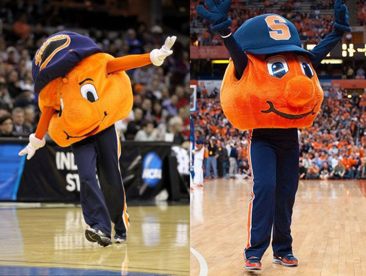 Syracuse's "Otto the Orange" was adopted by the university as their official school mascot in 1995 following his use in an unofficial capacity for nearly 20 years. Since 2004 Syracuse's teams have been known as the Orange (previously they were the Orangemen and Orangewomen), the name was applied simply because that was the predominant color of the team. The school previously had worn pink in the late 19th century... Syracuse Pinkmen probably wouldn't have stuck around as long.