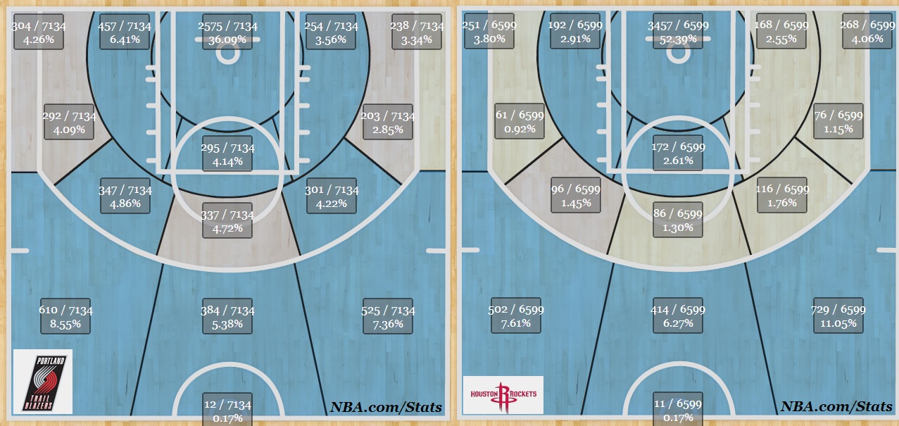 What's more, Houston isn't particularly adept at preventing teams from shooting threes, allowing the sixth highest amount in the league this year. Teams have been shown to be able to exert an influence on how many threes an opponent takes far more than how many they make, and so it appears Portland is free to shoot. The Blazers, meanwhile, did an excellent job chasing teams off the line but allowed 101 attempts in four games against Houston this year, three of which the Rockets won.