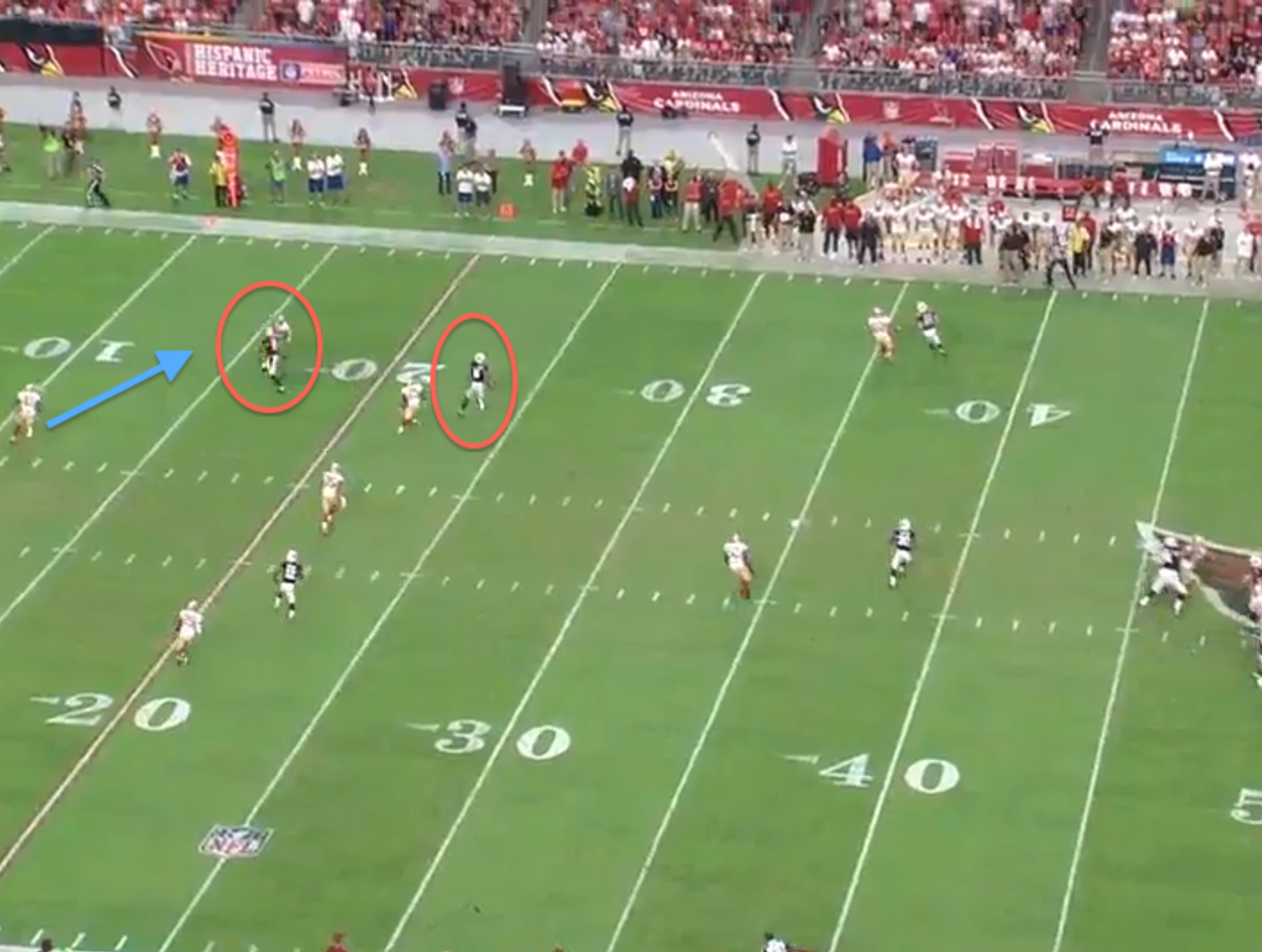 In Week 3, against the San Francisco 49ers, the Cardinals dialed up the same concept on second-and-30. They had Floyd and Fitzgerald to the same side, except they spread them out. Floyd was outside the numbers. Fitzgerald was in the slot.