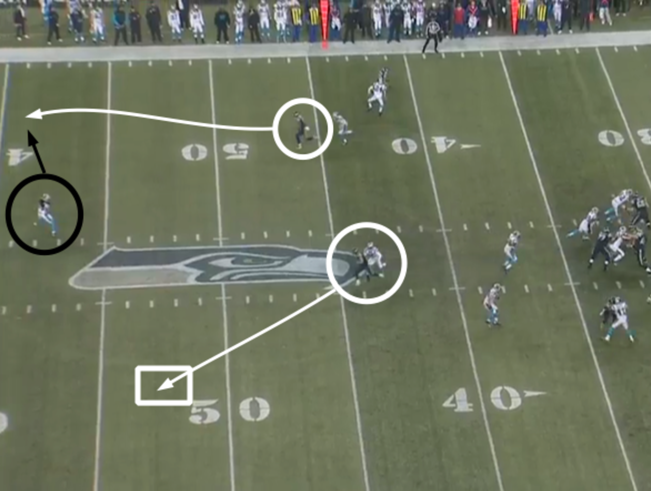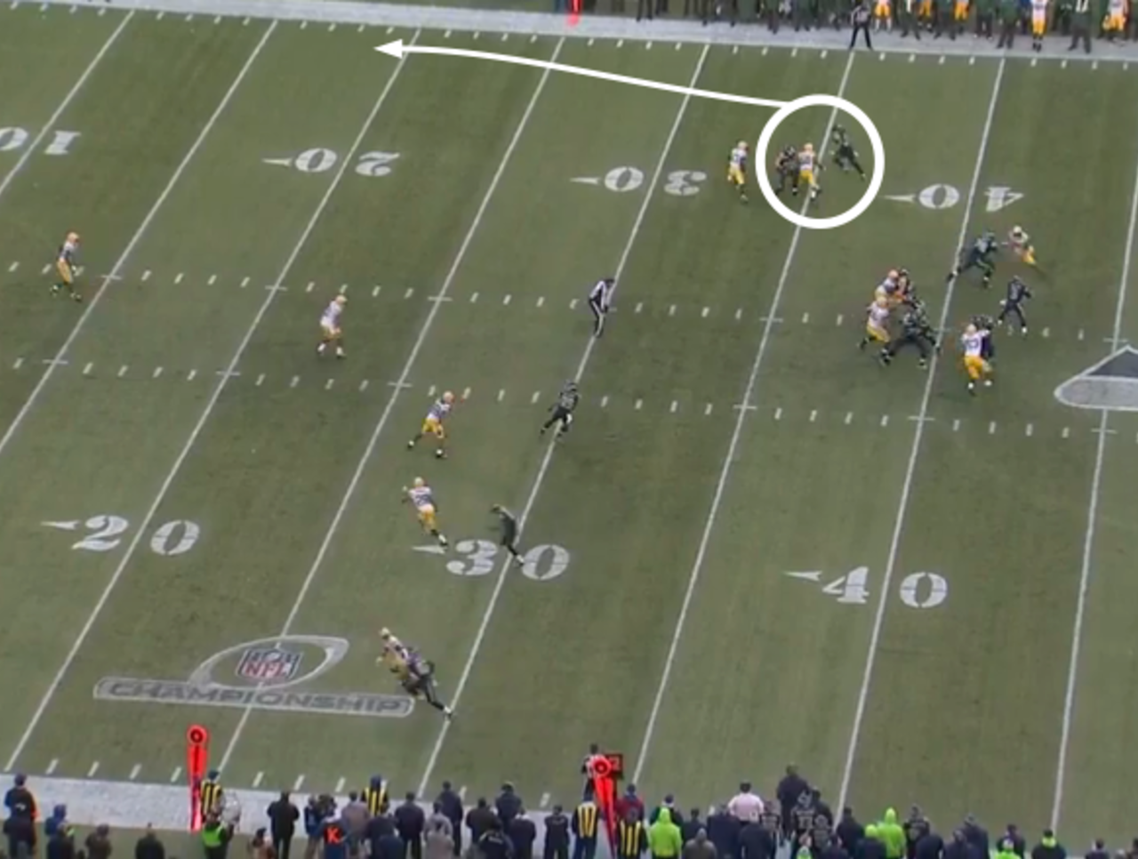 With the strong safety stuck in the trenches, the Seahawks' No. 2 receiver zoomed downfield on a go-route while the No. 3 receiver crossed to the deep half of the field. That forced the free safety to decide who to cover.