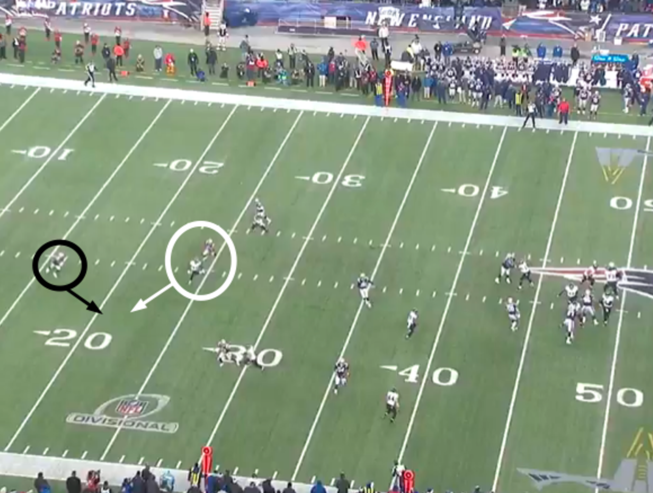 The tight end beat the jam and ran toward the left sideline, trailed by the strong safety. That left the Patriots with one deep safety, Devin McCourty.