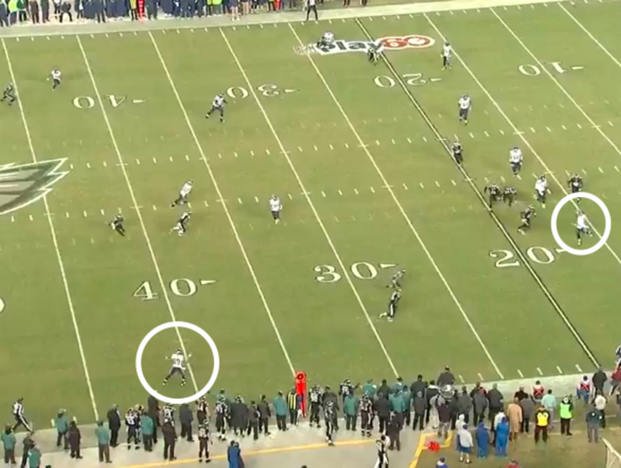 The Eagles' rush had been disciplined to that point and hadn't fell for the baiting blocks of the Seahawks' linemen. They abruptly crumbled. The four-technique end who contained the outside found himself inside the backfield dancing with Wilson.