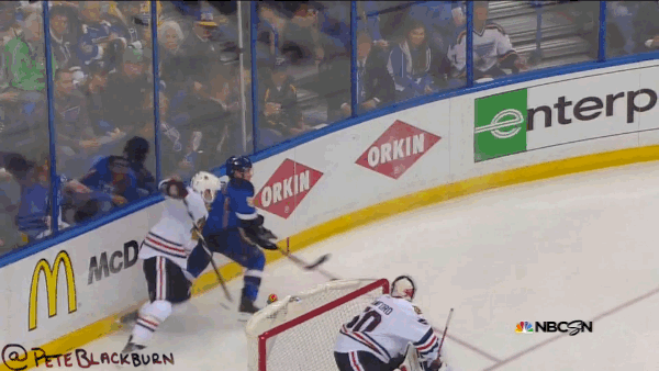 Patrick Kane made Blues netminder Ryan Miller look silly on a breakaway in the first period, meanwhile St. Louis Blues enforcer Adam Cracknell scored his first of the season, which, kind of says it all.