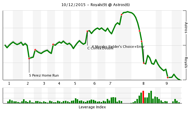 Houston, finally back in the postseason - again via the wild card - held a convincing 6-2 lead over the Kansas City Royals in the eighth inning of Game 4 of the 2015 ALDS. Spearheaded by their new middle-infield combo of Jose Altuve and an emerging Carlos Correa, the Astros simply needed to record six outs to reach their first ALCS.