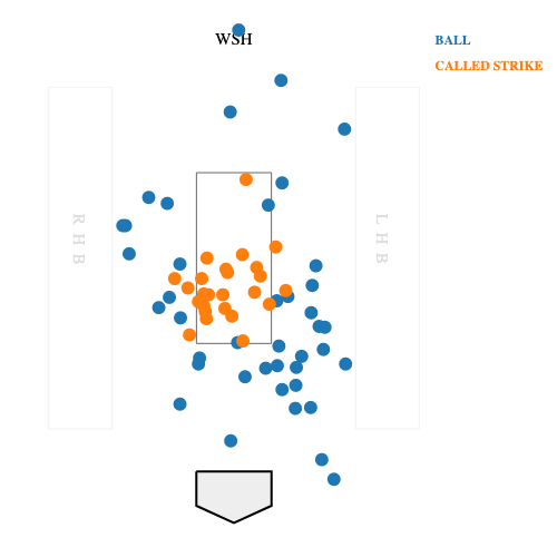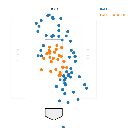 The call presaged an altogether forgettable night for home-plate umpire Sam Holbrook, whose strike zone - as illustrated below - was consistently inconsistent.