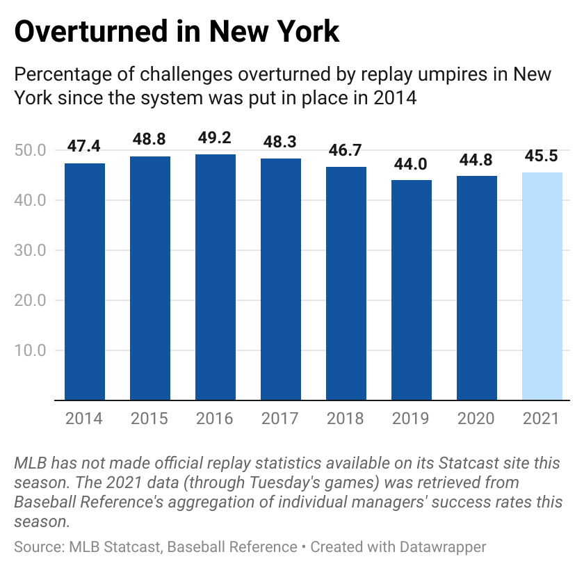 Tag plays, for instance, can be tricky to judge and are becoming overturned less frequently. From 2014-2017, challenged tag calls were overturned at rates between 49.7% (2014) and 45.3% (2015), according to MLB's own Baseball Savant. But the most recent available data shows those rates have decreased to 39.2% (2019) and 38.6% (2020). (There is no 2021 data available on the site.)