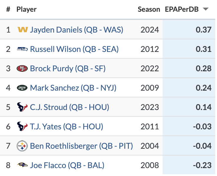 Daniels finished the regular season with 0.15 EPA/dropback, tied with Joe Burrow for seventh among this campaign's top quarterbacks. He's more than doubled that mark to this point in the playoffs, the best postseason performance of any rookie quarterback who started two-plus games since at least 2000.