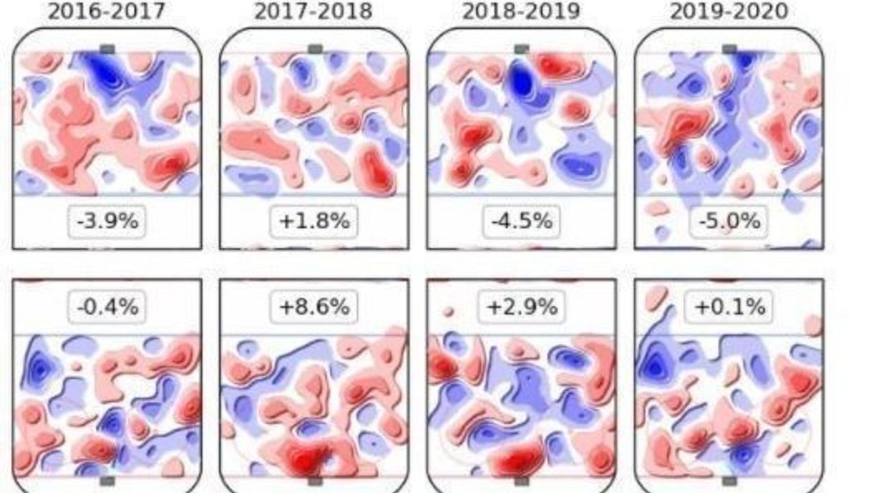 Plus is good in offensive zone (top row), negative is good in the defensive zone (bottom row)