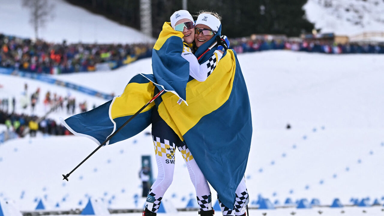 Sweden's Frida Karlsson and Ebba Andersson embrace at the finish line of the women's 10km + 10km skiathlon after winning gold and silver, respectively. Karlsson grabbed a Swedish flag from a spectator prior to crossing the line, finishing 51 seconds ahead of the competition.
