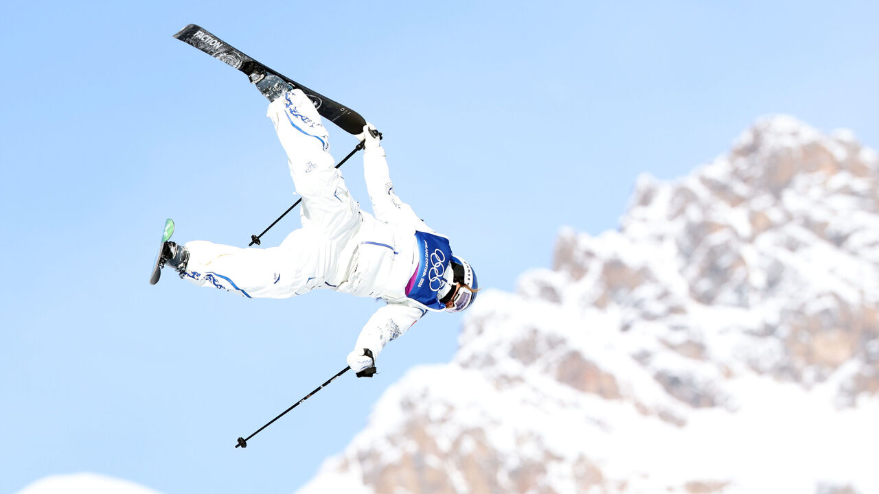Eileen Gu goes aerial during women's freestyle skiing slopestyle qualification. The American-born Chinese star overcame a fall during her first run to qualify for Monday's finals.