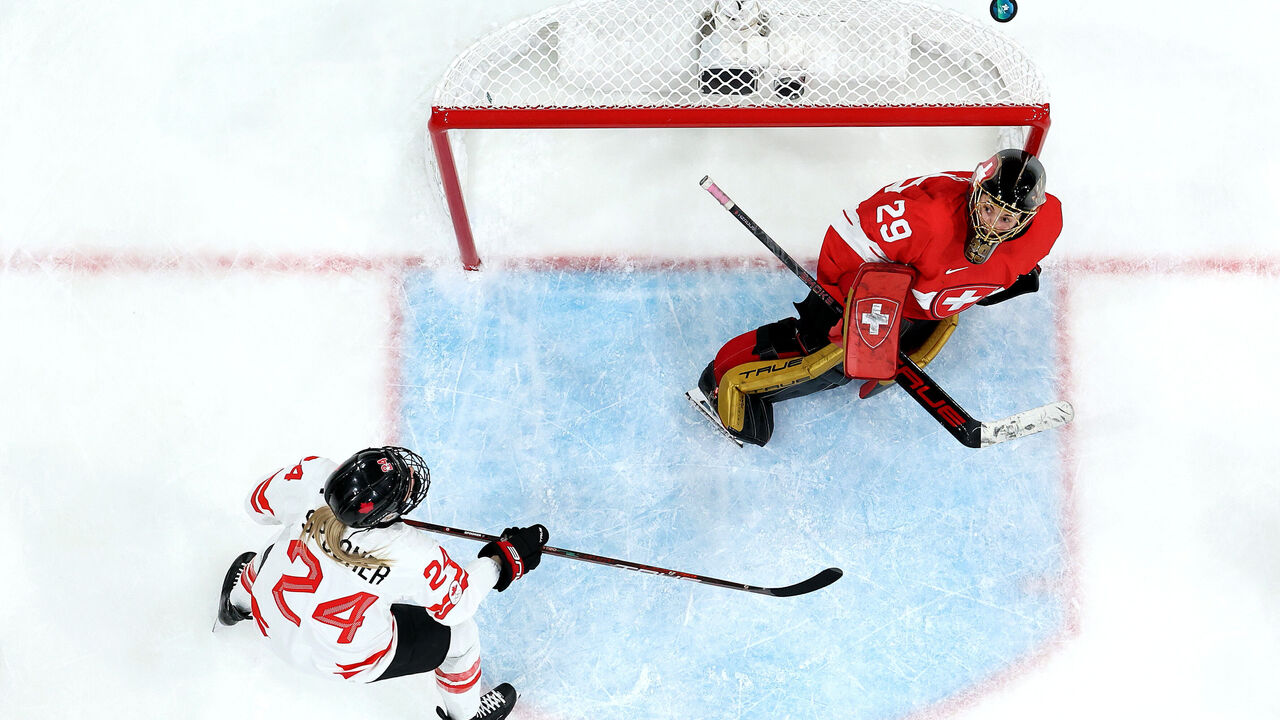 Natalie Spooner watches a puck sail above the net against Switzerland in Canada's hockey opener. The reigning Olympic champs had their tournament start delayed by Finland's stomach virus. Spooner went on to score the opening goal of the game, a decisive 4-0 victory.